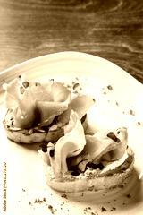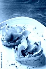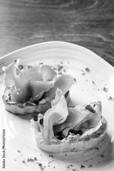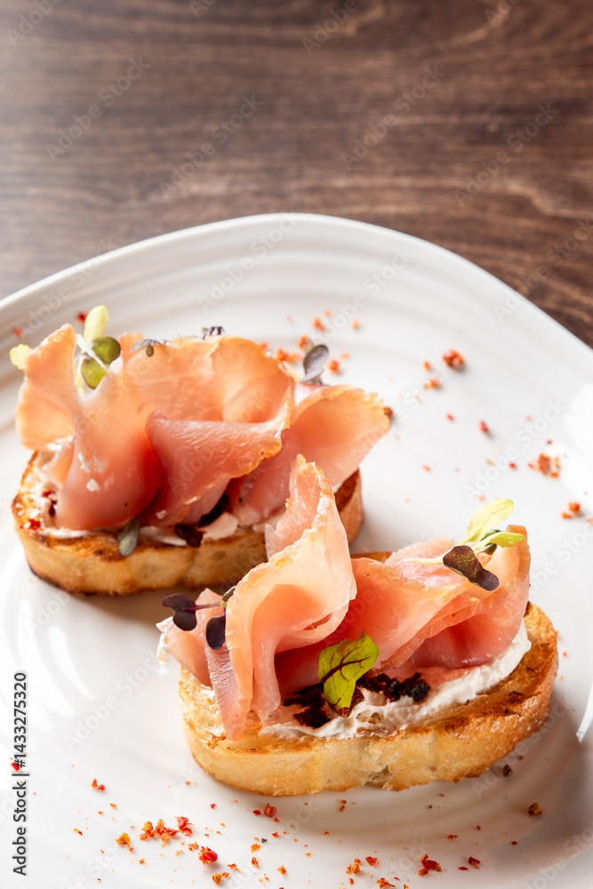 Elegant crostini topped with smooth cream cheese and thinly sliced smoked salmon, garnished with microgreens, served on a white plate, creating a sophisticated appetizer.
