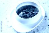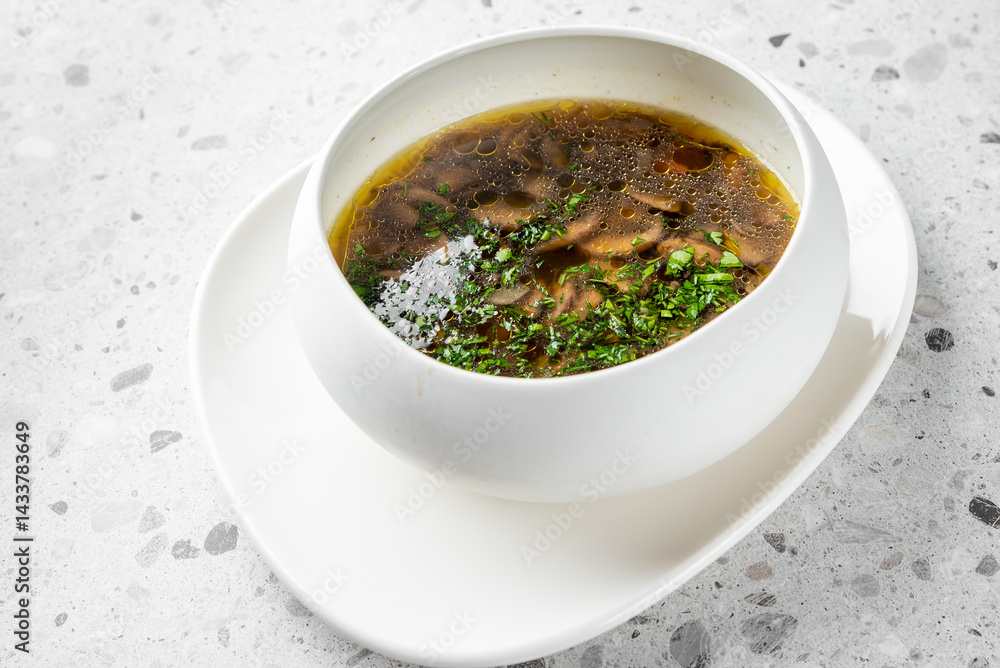 A warm bowl of hearty mushroom soup with fresh herbs and spices, served in a sleek white bowl on a modern textured surface, ideal for comfort dining.