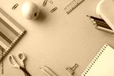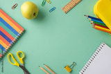 School supplies arranged on a green surface featuring pencils, notebooks, scissors, and an apple