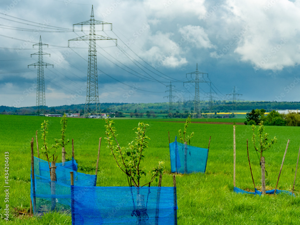 Junge Apfelbäumchen in der Nähe von Strommasten