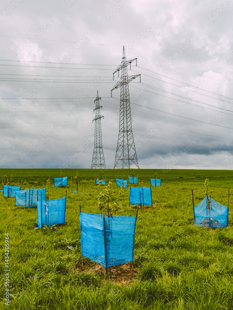Junge Apfelbäumchen in der Nähe von Strommasten