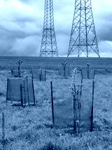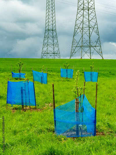 Junge Apfelbäumchen in der Nähe von Strommasten