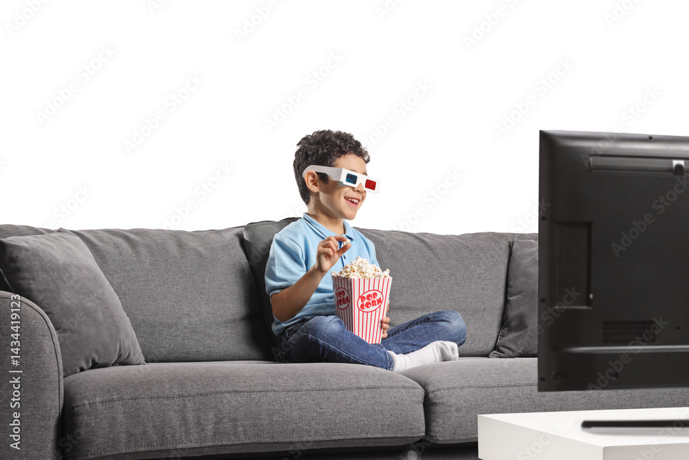 Boy sitting on a sofa watchign tv with 3d glasses and eating popcorn