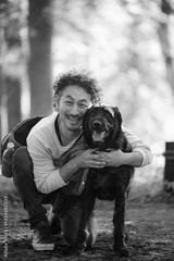 犬を散歩する男性 ドッグトレーナーや飼い主などの仲良しなイメージ カメラ目線
