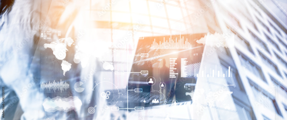 Business dashboard with key performance indicators on a virtual screen city interface