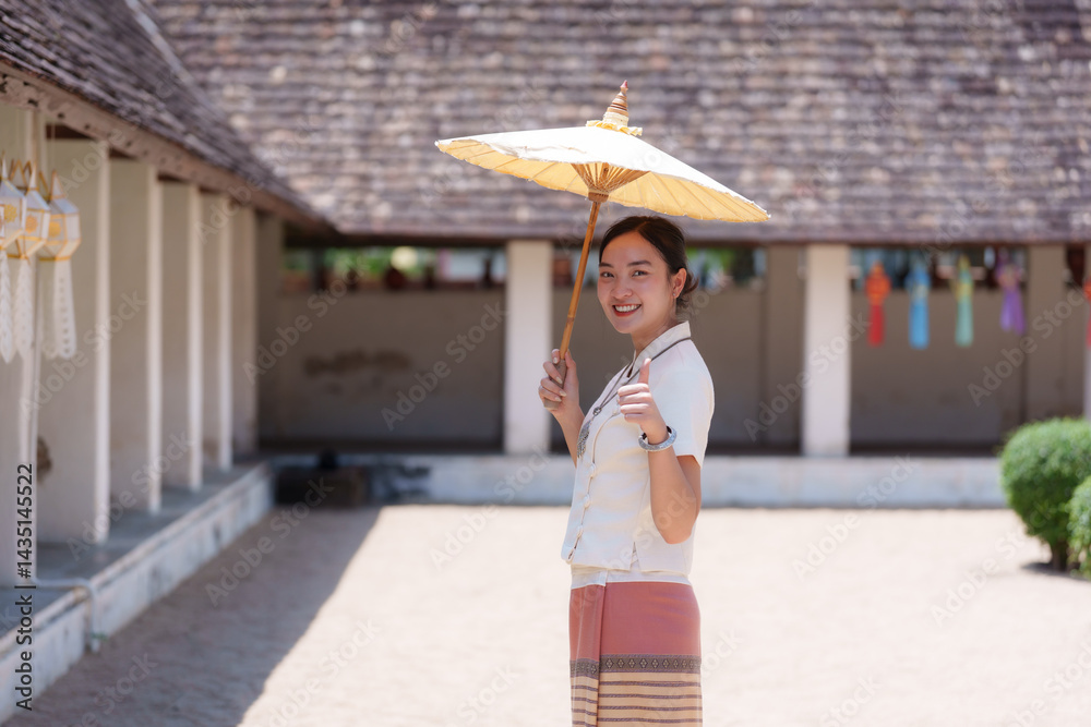 Smiling young woman wearing traditional clothing holding a parasol and gesturing thumbs up in a temple courtyard, showing approval and satisfaction with her cultural experience