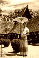 Young woman in traditional thai clothing holding a parasol stands in the courtyard of a historic temple, showcasing the rich cultural heritage of thailand