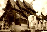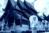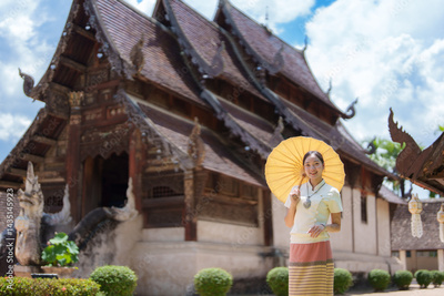 Young woman wearing traditional northern thai clothing holding yellow umbrella posing in front of wat ton kwen, a beautiful wooden temple in chiang mai, thailand, on a sunny day