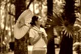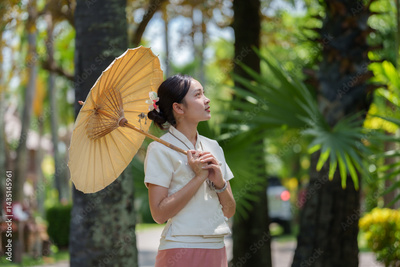 Young asian woman wearing traditional clothing holding a parasol in a tropical garden setting, enjoying the peaceful atmosphere and cultural heritage