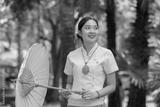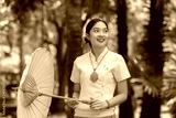 Smiling thai woman wearing traditional clothing and silver pendant holds a parasol made of natural materials, standing in a lush tropical garden, enjoying the serene atmosphere