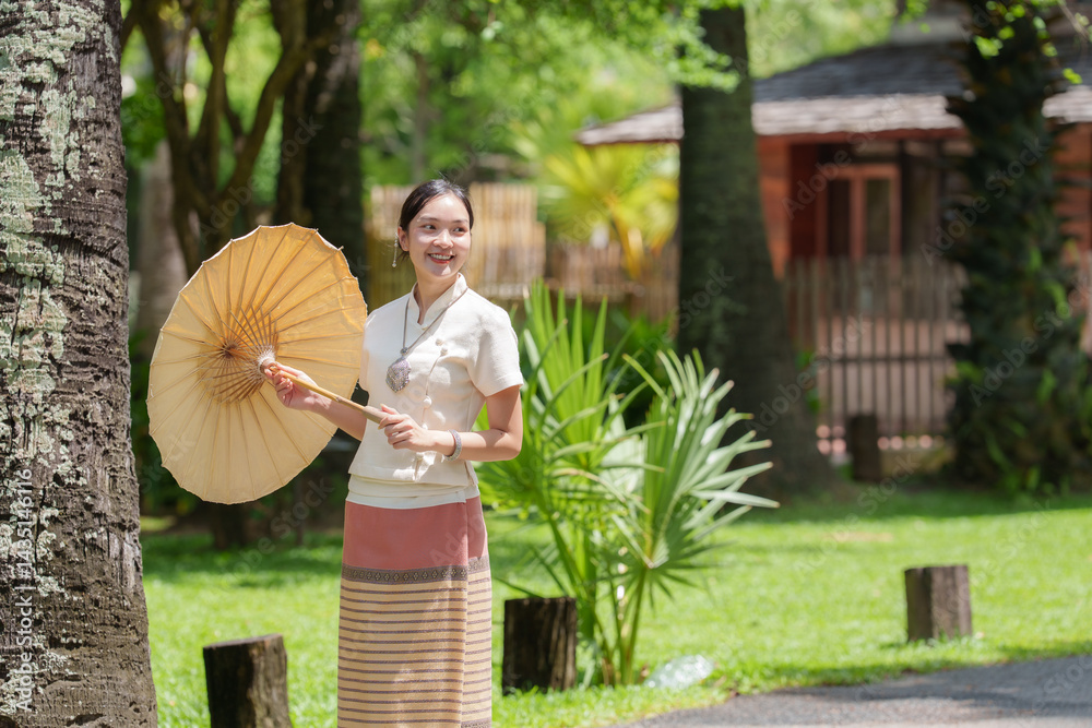 Smiling thai woman wearing traditional clothing holding a parasol in a tropical garden setting, enjoying the sunny weather and showcasing cultural heritage