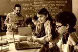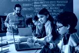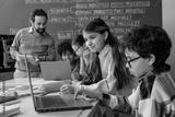 Group of diverse students collaborating on laptop projects with teacher guiding in classroom setting. Background includes chalkboard with equations written