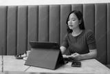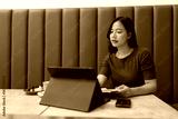 Asian freelancer woman working on a tablet in a cozy cafe, savoring a cup of coffee and indulging in a delicious blueberry cheesecake while holding a notebook in her hand