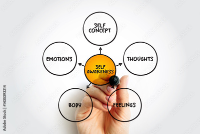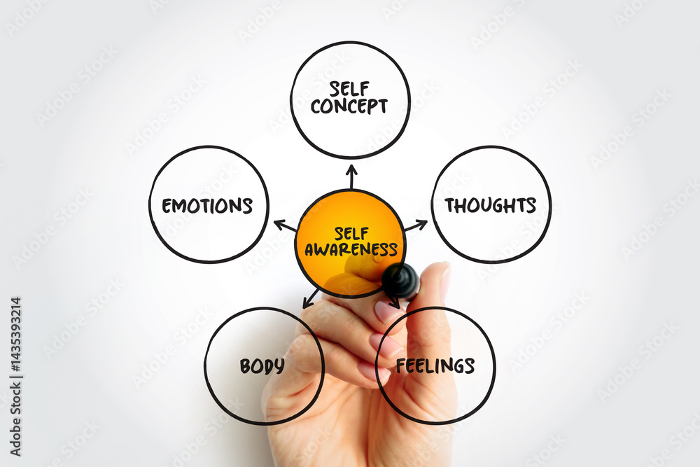 Self-awareness is the ability to focus on yourself and how your actions, thoughts, or emotions do or don't align with your internal standards, mind map concept background
