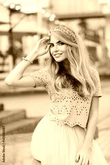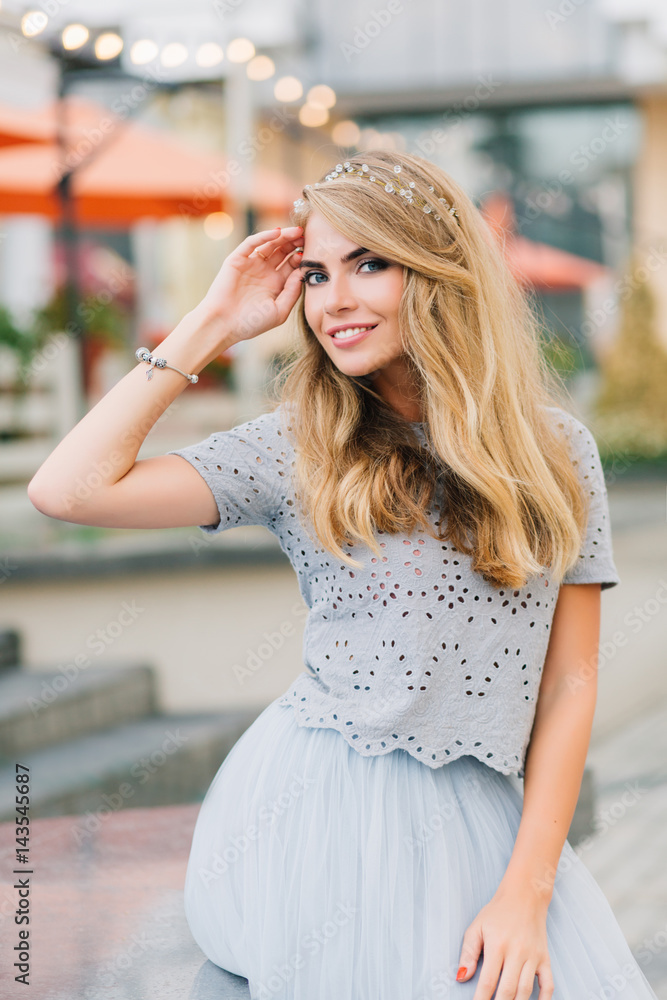 Portrait beautiful girl with long blonde hair in blue tulle skirt sitting on terrace background. She keeps hand on head and smiling to camera