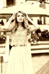 Cute girl with long blonde hair in blue tulle skirt is walking on terrace background