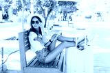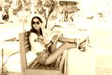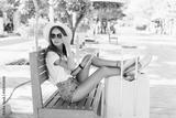 Cute girl-traveler sit on a blue bench with legs stretched onto a yellow suitcase. She holds a tablet in yellow case. She wears denim shorts, t-shirt, dark sunglasses, white sneakers and straw hat.