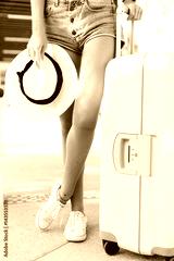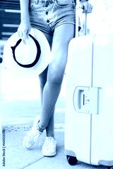 Close-up of girl's slim tanned legs. She stands next to yellow suitcase holding straw hat and wearing denim shorts and white sneakers.
