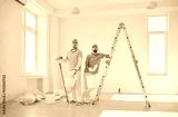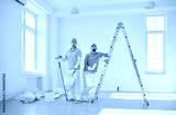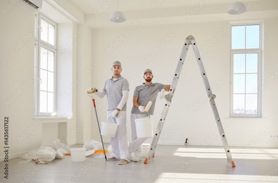 Two professional painters in work uniform standing near ladder in bright empty room, holding buckets and painting tools. Male workmen looking at camera, preparing for renovation and wall painting.