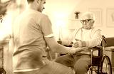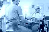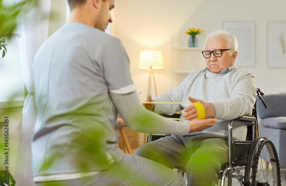 Wheelchair senior man elastic band exercises for arms with medical brother, consultant nursing, health and social care of elderly, doctor, male geriatric nurse helping old patient rehabilitation