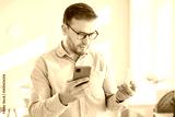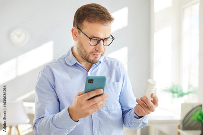 Concerned young man in glasses holding smartphone and medicine bottle in bright room. Worried person reading or searching for information in internet, checking prescription details or side effects.