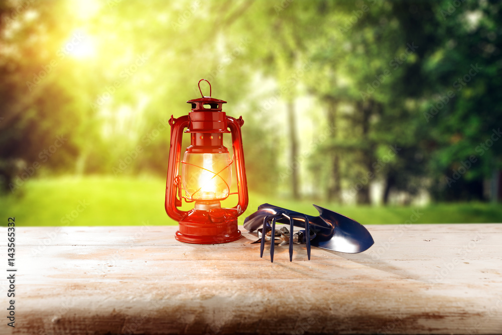 Still life with small kerosene lamp on a wooden table in the garden. Garden tools in spring time.