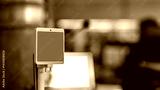 Interactive kiosk showing green screen for mockup in a busy retail store with blurred background