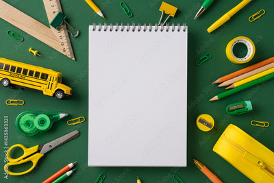 A collection of colorful school supplies arranged around a blank notepad on a green surface