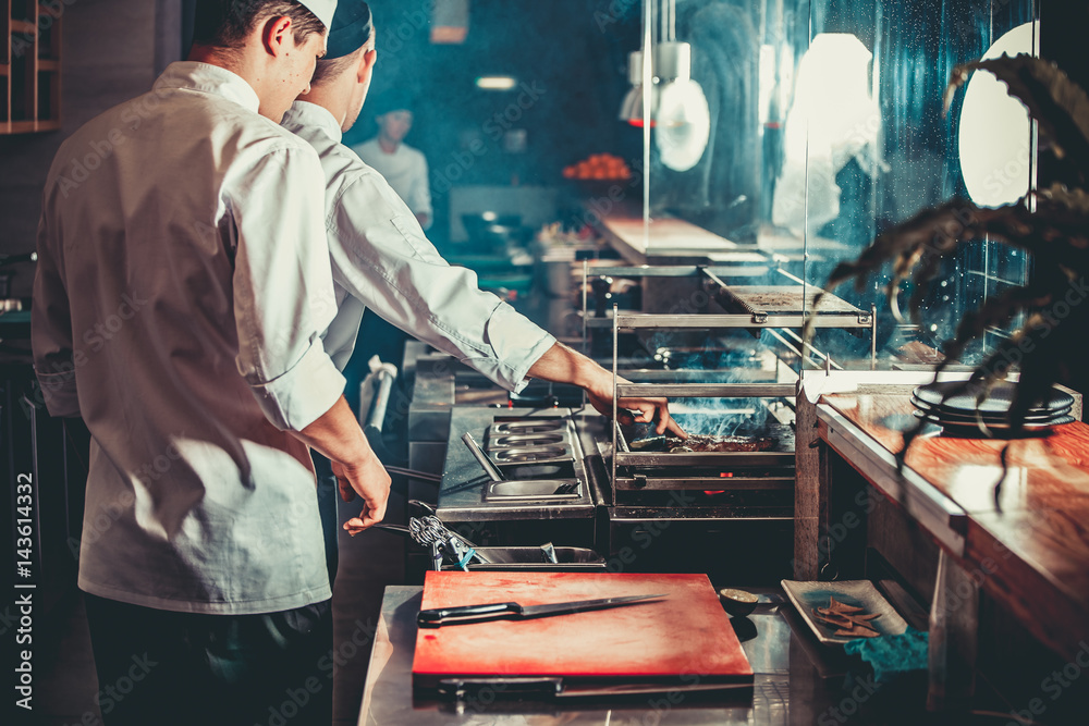 Food concept. Two chefs in white uniform monitor the degree of roasting meat with hand in interior of modern restaurant kitchen. Preparing traditional beef steak on barbecue oven from stainless steel