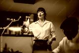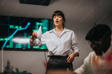 A confident woman explaining financial data to colleagues, highlighting charts and trends on a screen during a meeting in a modern office setting.