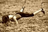Beautiful young woman doing TRX exercise with suspension trainer sling in the outdoors