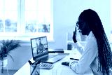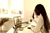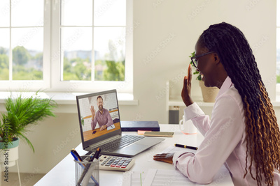 Diverse business woman and man having online work meeting via video call. Happy African American woman financial accountant sitting at her office desk, smiling and waving hello at laptop computer