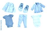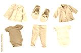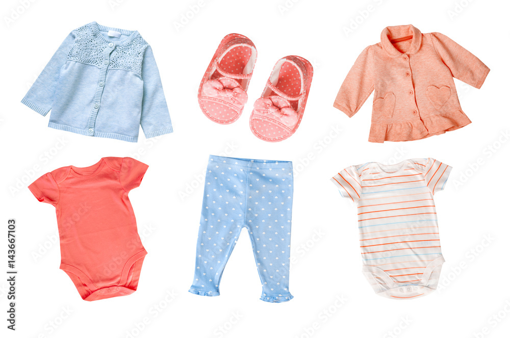 Pastel colors cotton baby child girl clothes set collage isolated.