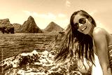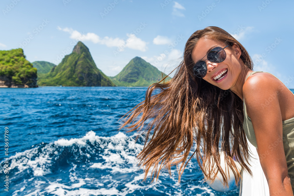 Happy tourist girl having fun on boat ride towards the deux gros pitons, famous attraction in St Lucia. World Heritage site. Young woman on shore excursion from cruise ship vacation travel.