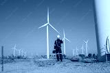 Engineer wearing uniform inspection and survey work in wind turbine farms rotation to generate electricity energy. Maintenance engineer working in wind turbine farm at sunset.