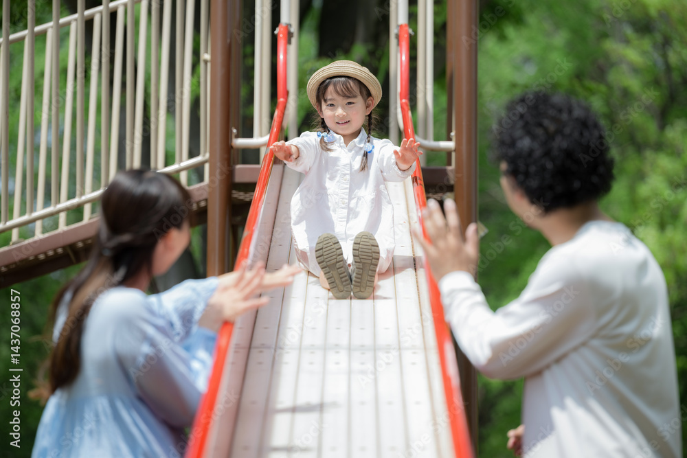 Parent and child playing on a slide in a park Smiling child