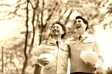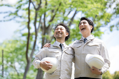 新緑の背景で作業着姿でビルの前で施工管理などの作業者のイメージ 肩を組む未来などを見上げる