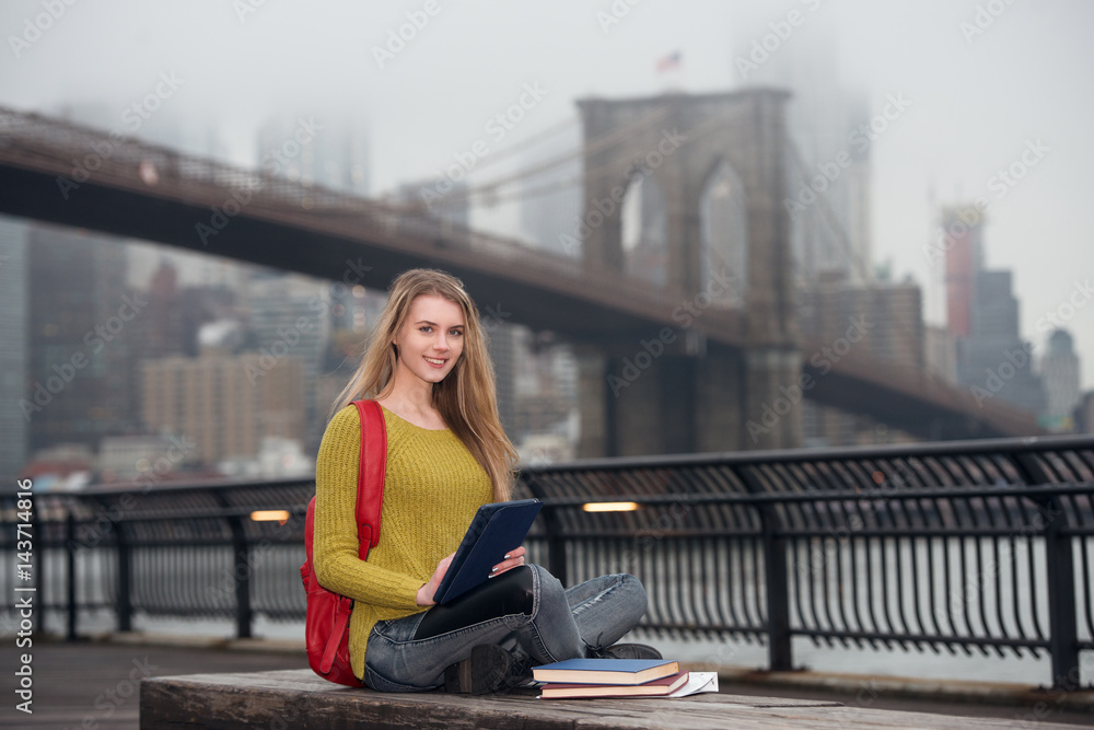 Beautiful young student girl using tablet pc outdoors in the city and study.