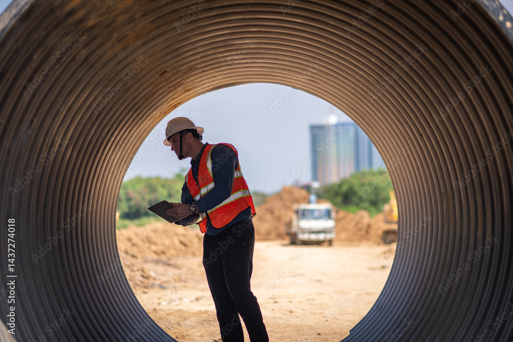 Engineer worker operations construction plans large black drainage pipe installing underground infrastructure heavy machinery importance of careful planning and teamwork in construction project.