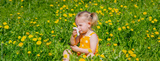 A girl in a dandelion field, holding a handkerchief to her nose, showing signs of allergies.