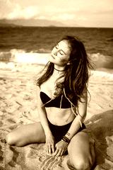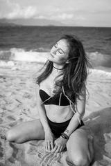 Brunette woman with beautiful body on a tropical beach. Exotic country travel and rest concept.