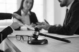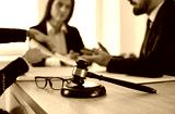 Close up of judge's gavel and glasses on table, with lawyer meeting with group of angry, complaining clients in background, giving legal advice, and helping with problem in court. Law services concept