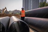 Engineer worker operations construction plans large black drainage pipe installing underground infrastructure heavy machinery importance of careful planning and teamwork in construction project.