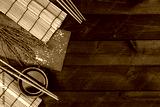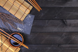 Sushi chopsticks and soy sauce on black background. Top view with copy space.