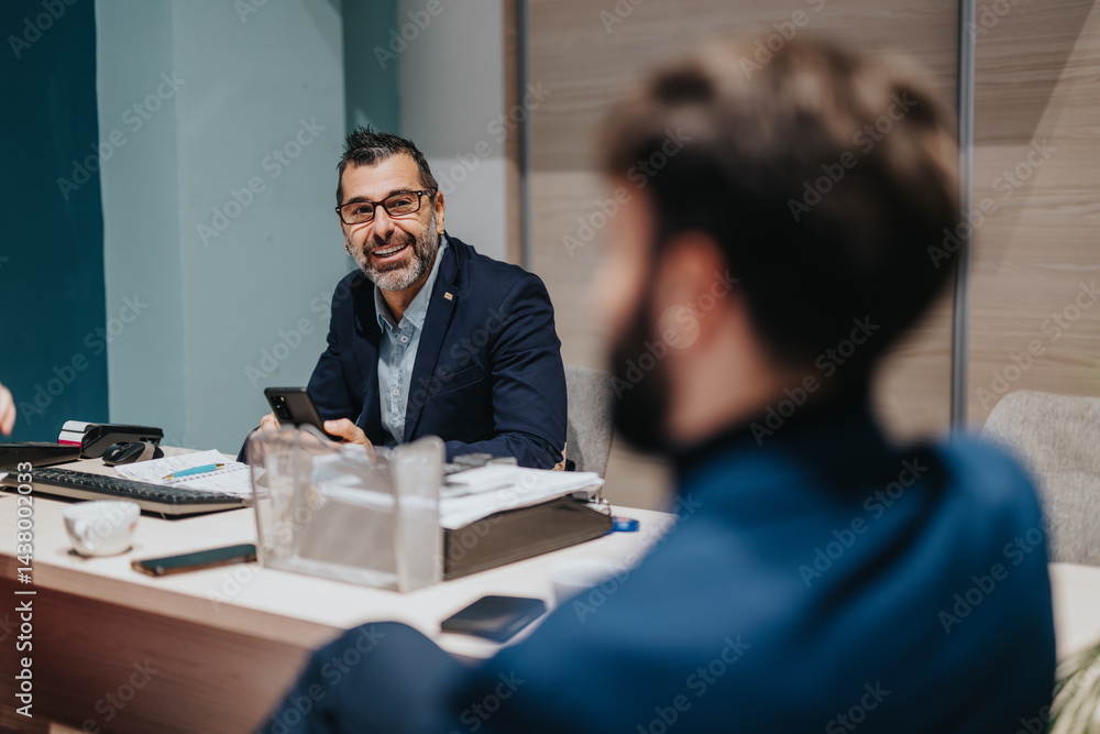 Two colleagues sit together during a professional discussion, focusing on collaborative work in an office environment.
