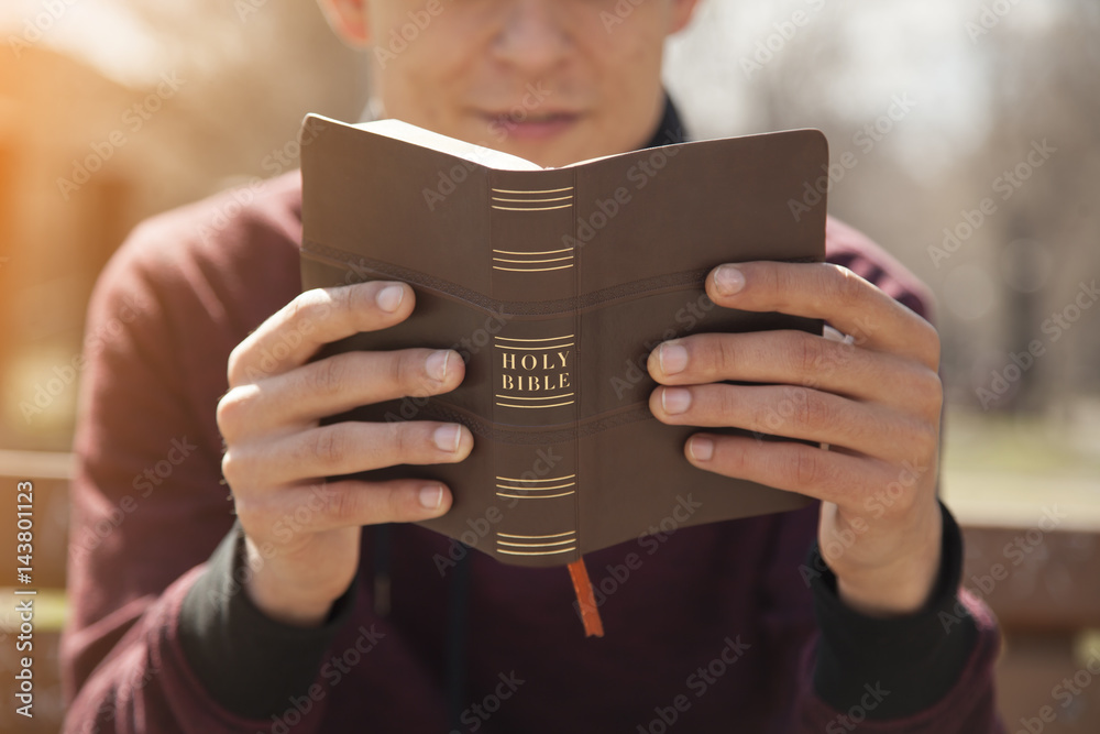 Young man holding and reading holy bible