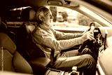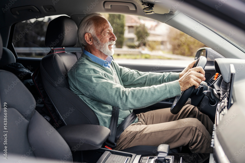 Side view of senior driver in smart causal driving his car.