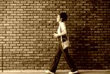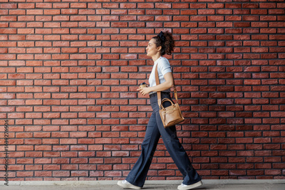 Side view of young fashionable interracial girl walking by the brick wall on city street downtown.