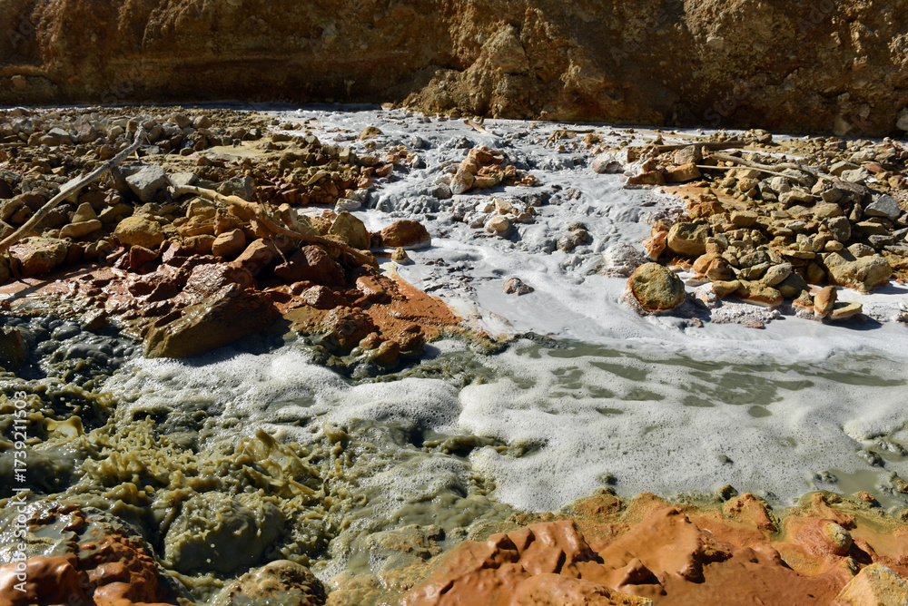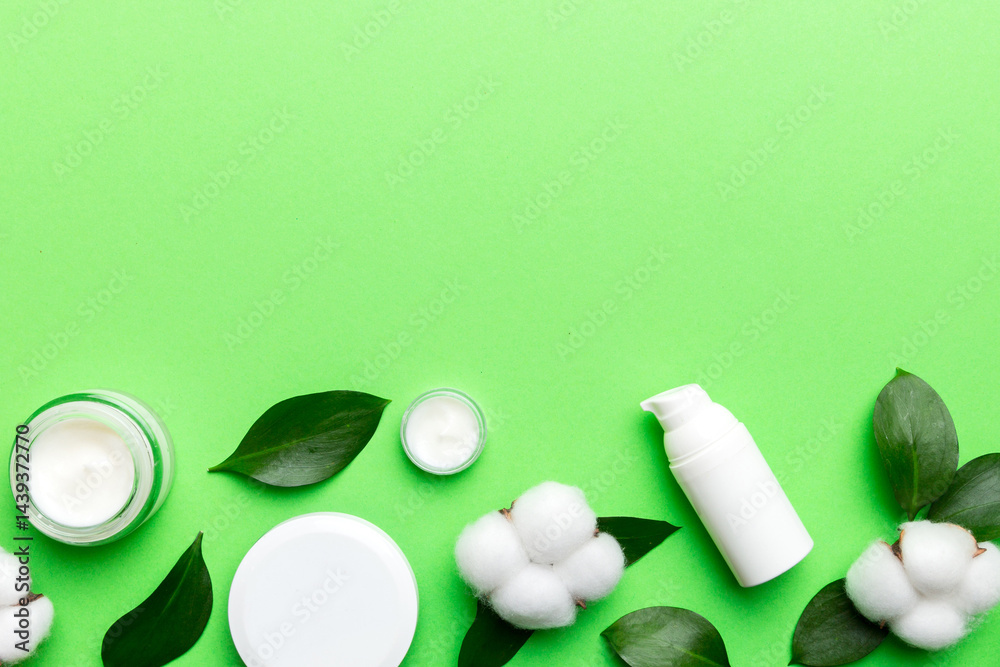 Organic cosmetic products with cotton flower and green leaves on color background. Copy space, flat lay