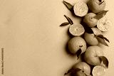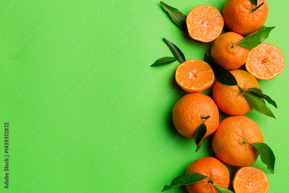 Many fresh ripe mandarin with green leaves on colored background, top view, space for text